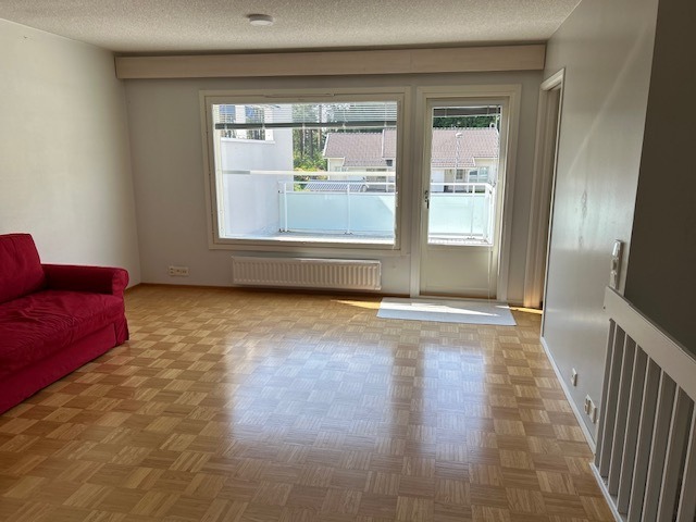 - Olohuone on yläkerrassa. Hyvän kokoinen ja valoisa huone, josta käynti isolle, länteen päin olevalle avoparvekkeelle. Seinät olohuoneessa on maalattu lasikuitutapetti. Lattia parkettia.