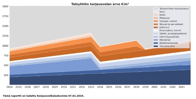 2026 Julkisivun elastisten saumojen uusiminen. Parvekkeiden elastisten saumojen uusiminen. Pihakannen kuntotutkimus ja kosteusvaurioiden korjaus. Rivipeltikatteen huoltomaalaus +tarpeelliset paikkakorjaukset. 2029 Rivipeltikatteen huoltomaalaus +tarpeelliset paikkakorjaukset. 2030 Märkätilojen korjaus 25 kylpyhuoneen osalta.