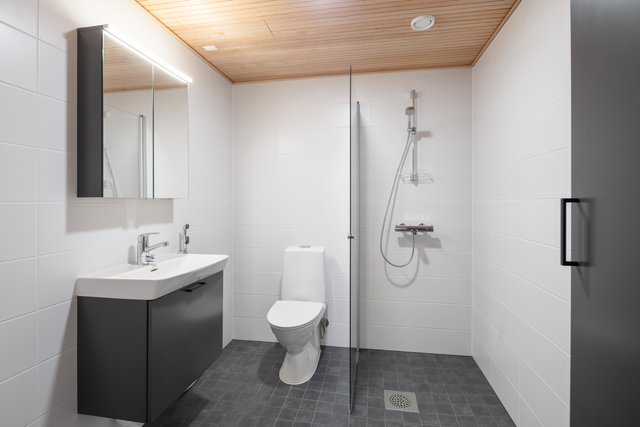 - WC-istuin, suihku, suihkuseinä, pesukoneliitäntä, lattialämmitys, peilikaappi, peili, pesuallas, allaskaappi, ja bidee-suihku