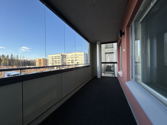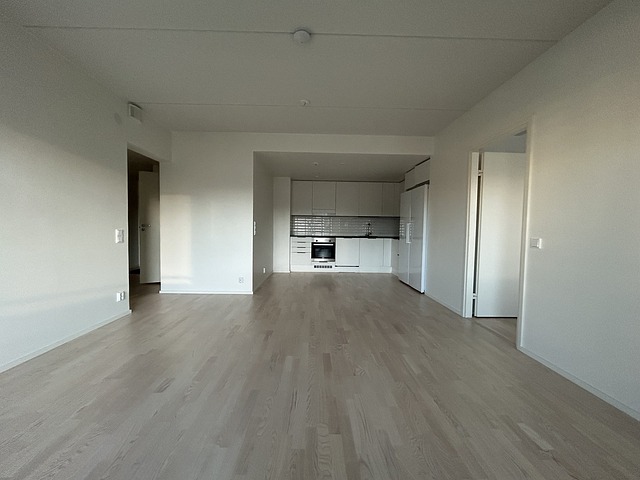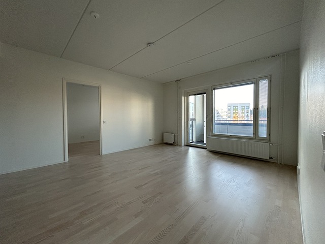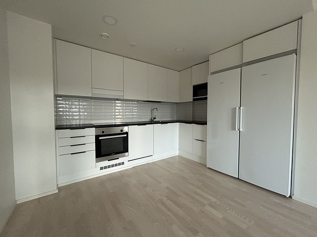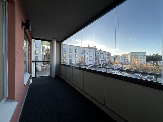 Keittiö ja olohuone muodostavat avaran ja valoisan tilan. Olohuoneesta on käynti isolle, lasitetulle parvekkeelle.