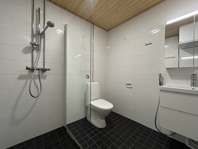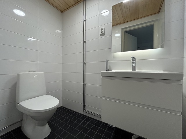 - Suihkuseinä, pesukoneliitäntä, peilikaappi, wc-istuin, ja suihku