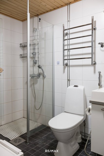 - WC-istuin, suihku, suihkuseinä, pesukoneliitäntä, peilikaappi, bidee-suihku, pesuallas, ja allaskaappi