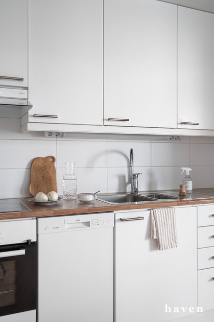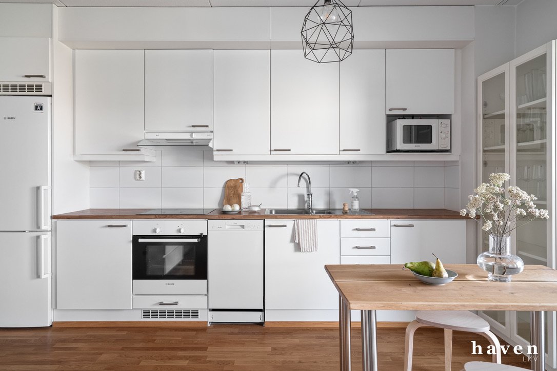 - Jääkaappi/pakastin, keraaminen keittotaso, uuni, liesituuletin, astianpesukone (2025). Tilava valkoinen keittiö, jossa hyvin lasku- ja kaappitilaa. Puutasot.