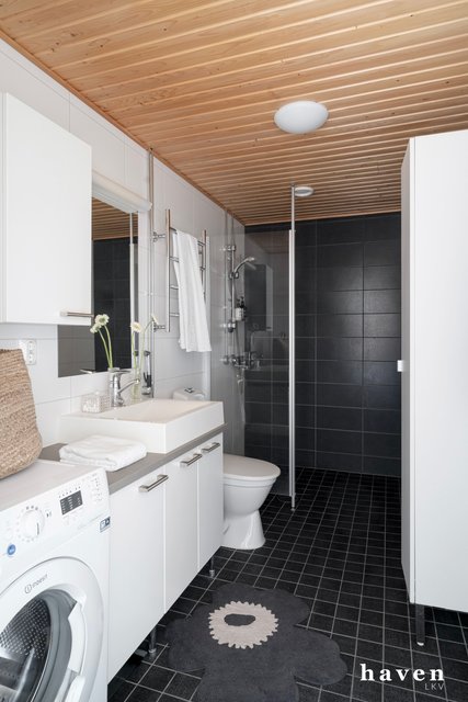- Tilava laatoitettu kylpyhuone lattialämmityksellä. Suihkuseinä, pyyhekuivain, seinä- ja allaskaapistot, pesukoneliitäntä ja oma tila pesutornille.