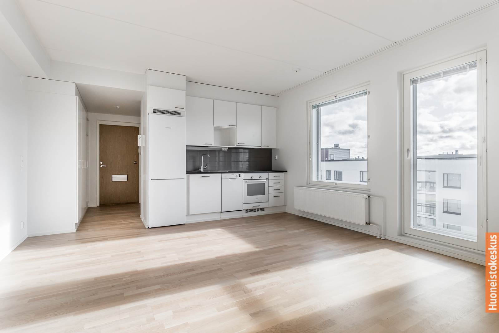 Yhdistetystä olohuoneesta ja avokeittiöstä ikkuna ja ranskalainen parveke kaakkoon.
