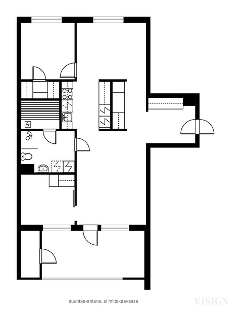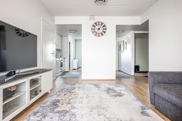 Kiva vähän erilainen pohja. Keittiö on omana tilanaan ja sen vieressä ruokailutila. Säilytystilaa on paljon; isommassa makuuhuoneessa vaatehuone, pienemmässä kaapistot ja tämän lisäksi eteisessä on runsaasti säilytystilaa. Päiväkodit ja koulut vieressä. Juna-asema aivan vieressä.