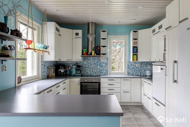 - Jääkaappi, liesituuletin, erillisuuni, astianpesukone, keittiösaareke, ja rikkaimuriluukku