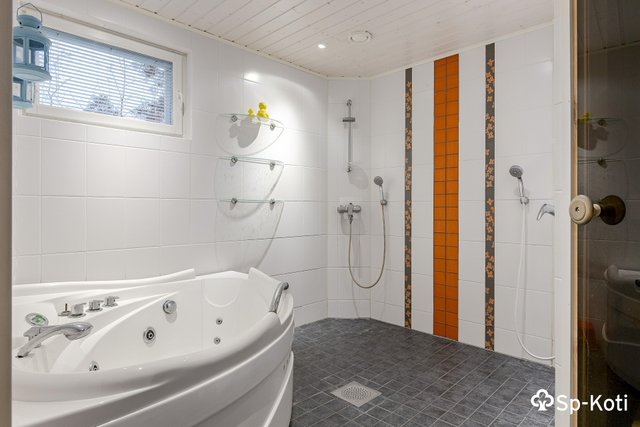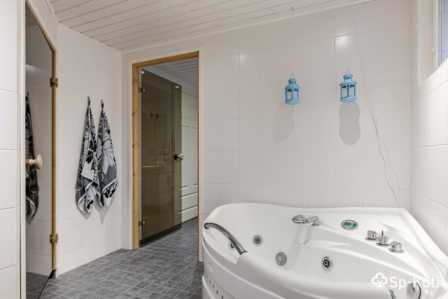 Alakerrassa on kodinhoitohuone, josta käynti ulos ja se kuraeteinenkin löytyy. Alakerrassa myös kaksi makuuhuonetta, tunnelmallinen takkahuone, hulppeat vaatehuone- ja varastotilat sekä erillinen wc. Lisäksi reilunkokoinen kylpyhuone, jossa myös wc ja pesuhuoneessa on poreallas kaksi suihkua sekä sauna joka on hetivalmis löylyttelyihin!