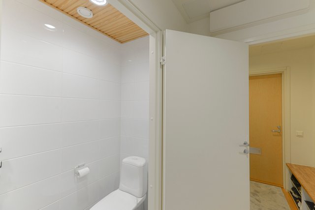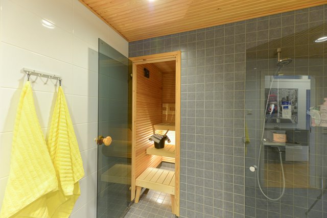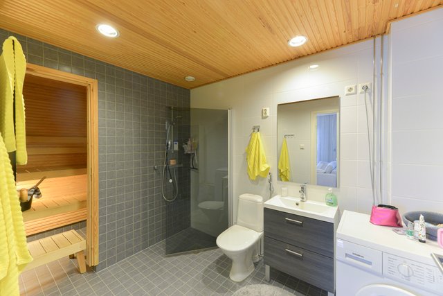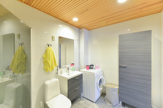 - WC-istuin, suihku, pesukoneliitäntä, lattialämmitys, peili, pesuallas, allaskaappi, ja suihkuovi, kaappi