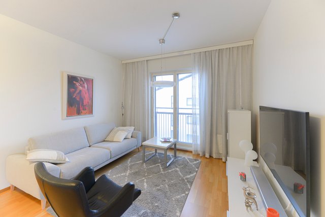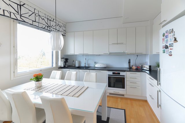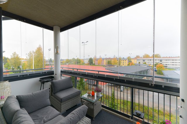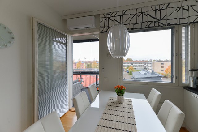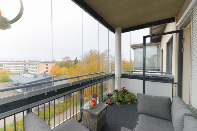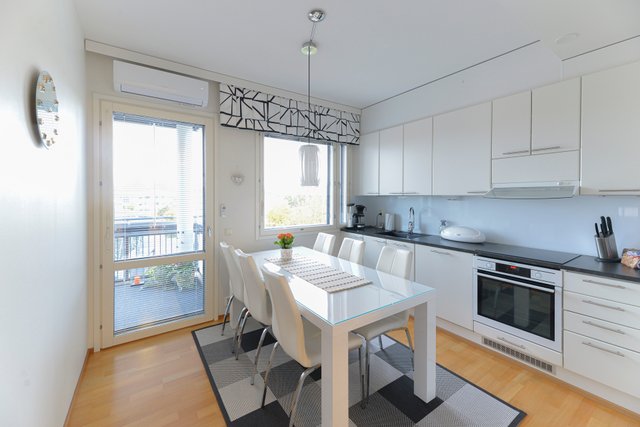 Keittiö on varustettu laadukkailla kodinkoneilla, kuten induktioliedellä ja erillisellä uunilla, mikä tekee ruoanlaitosta nautinnollista. Keittiöstä on käynti lasitetulle länsiparvekkeelle, missä voi nauttia ilta-auringon säteistä. Parveke tuo lisätilaa ja on kuin toinen olohuone kesäisin.