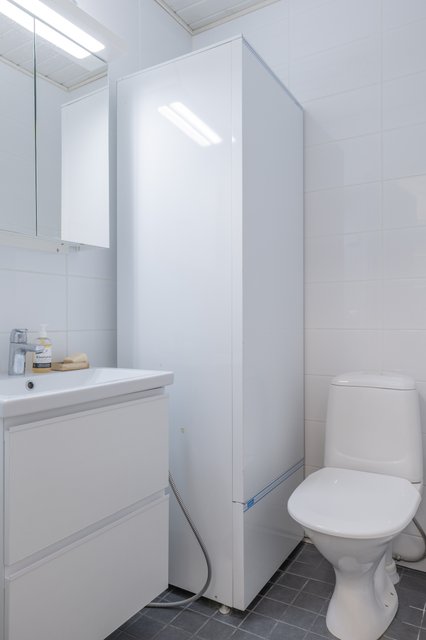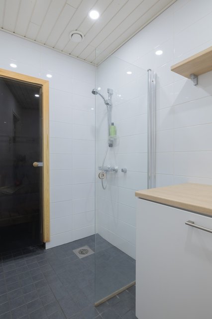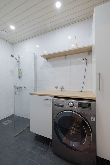 - Suihku, suihkuseinä, pesukoneliitäntä, ja lattialämmitys