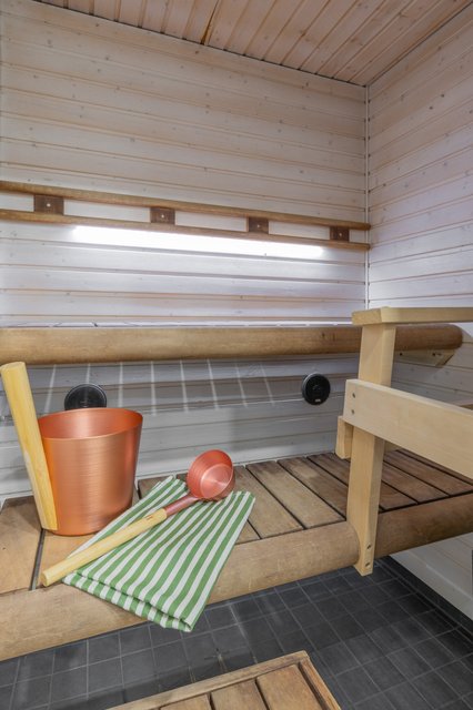 Asunnon pohjaratkaisu on porrastettu ja sisääntulon tasossa sijaitsevat tuulikaappi, vaatehuone, eteinen, kaksi makuuhuonetta, sauna ja pesutilat sekä erillinen wc. Muutaman askelman verran alaspäin sijaitsee moderni keittiö, sekä tilava olohuone, jonka yhteydessä on vuolukiven leivinuuni.