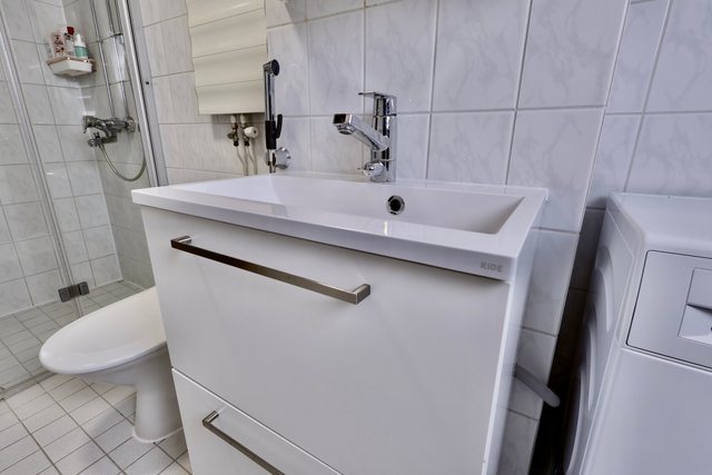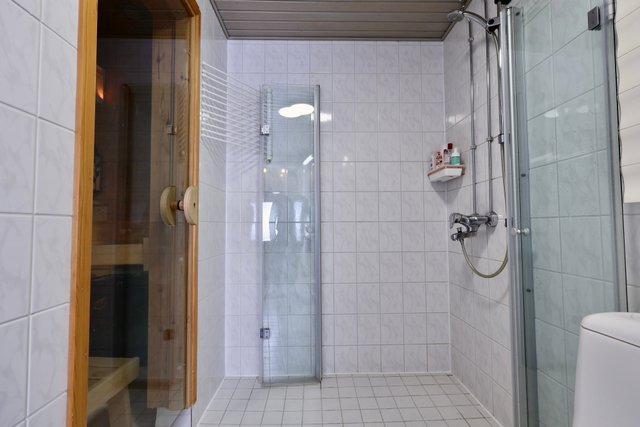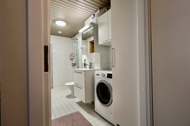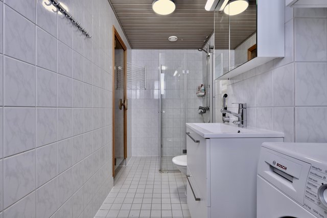 - WC-istuin, suihku, suihkuseinä, suihkukaappi, pesukoneliitäntä, allaskaappi, pesuallas, peilikaappi, ja kodinhoito kaappi