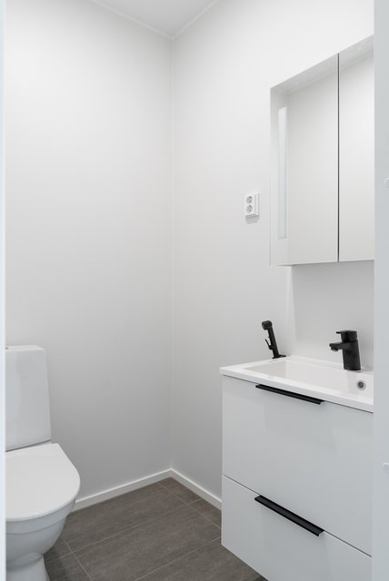 - WC-istuin, suihku, suihkuseinä, peili, pesukoneliitäntä, lattialämmitys, peilikaappi, pesuallas, allaskaappi, ja bidee-suihku