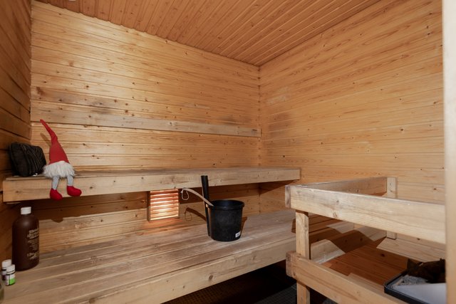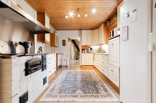 Kodissa on lämpöä varaava takka, joka luo tunnelmaa olohuoneeseen. Keittiössä on ruuan valmistukseen ja lämmön lähteenä puuhella.