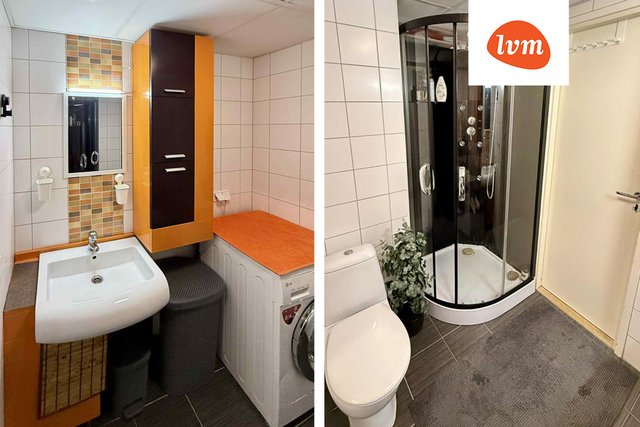 - WC-istuin, suihkukaappi, pesukone, pesukoneliitäntä, peili, pesuallas, ja allaskaappi