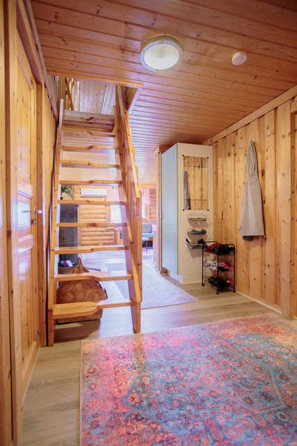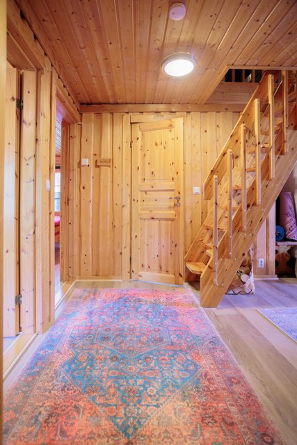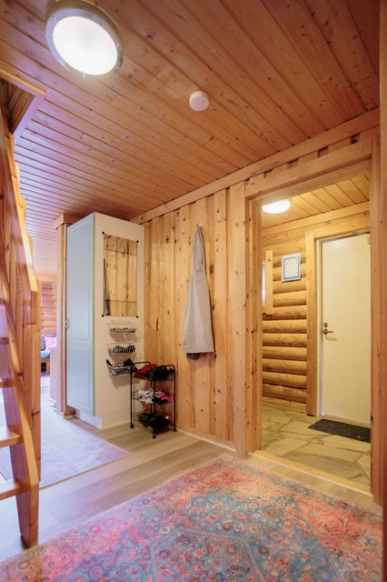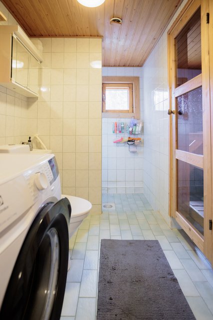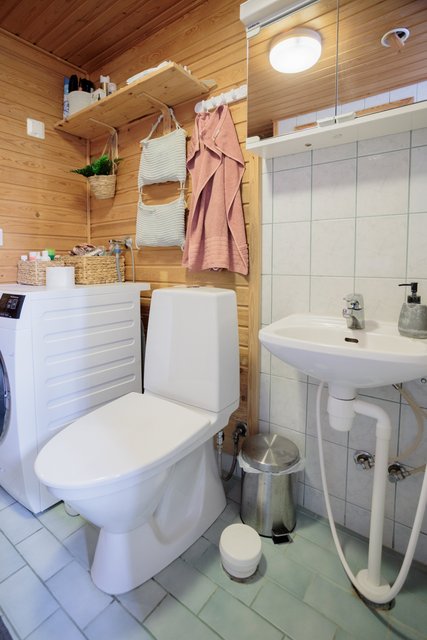 - Mökin pesutilat sijaitsevat ensimmäisessä kerroksessa. Pesutilat ovat mukavan avarat ja myös kodinhoitotilat on sijoitettu pesutiloihin. Pesutiloissa sijaitsee myös mökin wc.