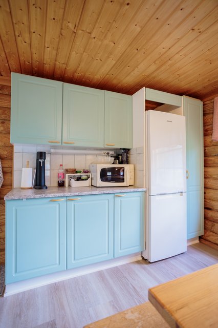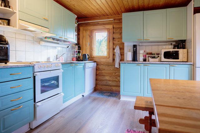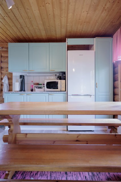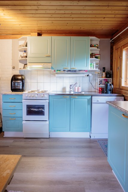 - Mökin keittiössä on mukavasti lasku- sekä kaappitilaa. Keittiö on asiallisessa kunnossa ja kokilla on mukavan avarat tilat työskennellä.