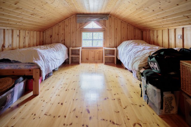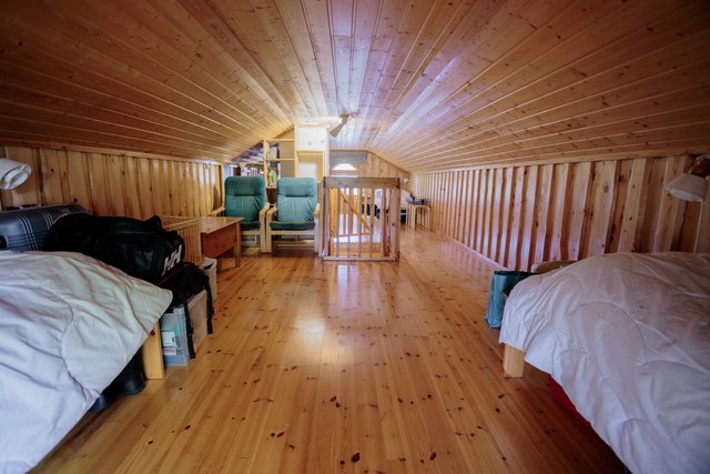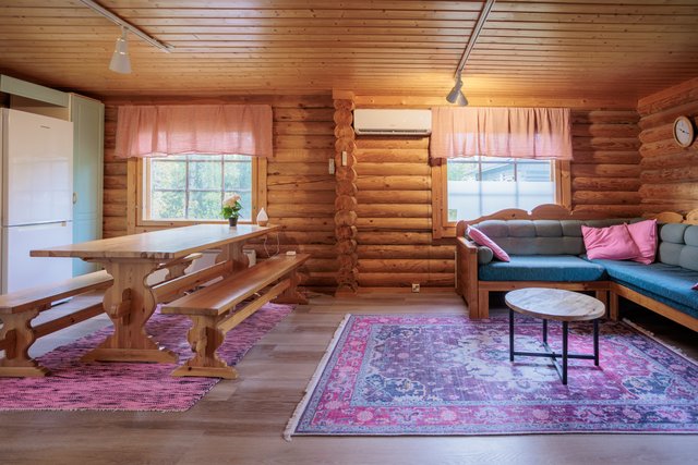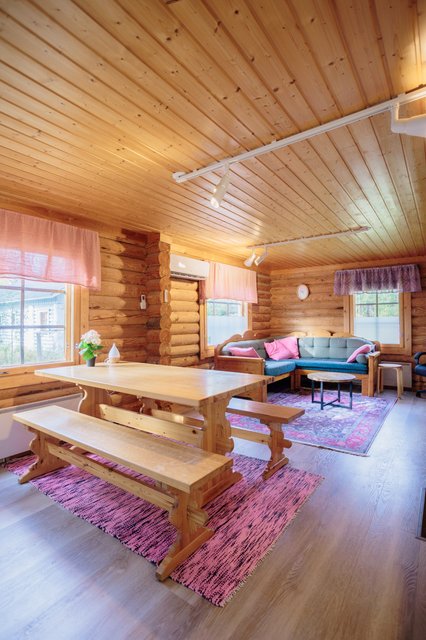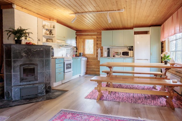 Avara tupa ja keittiö muodostavat kodikkaan ja toimivan kokonaisuuden, jossa riittää tilaa niin perheen kuin ystävienkin yhteisiin hetkiin. Pyöröhirsiseinät ja suuret ikkunat tuovat tilaan valoisuutta ja lämpöä, ja keskellä tupaa sijaitseva kaunis tulisija luo viihtyisän tunnelman sekä mukavaa lisälämpöä talvi-iltoihin.