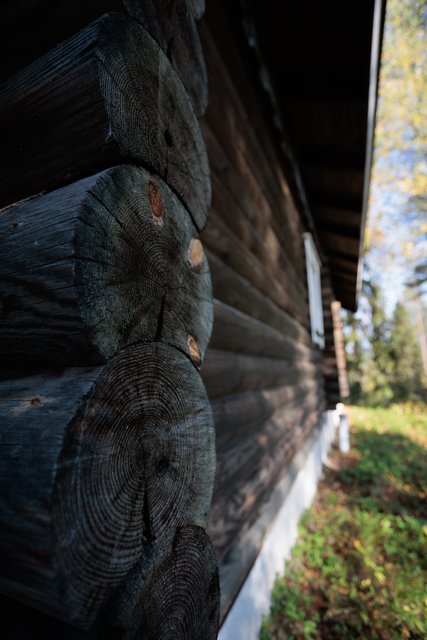 - Valmistettu etelän pystyyn kuolleesta puusta sorvatusta hirrestä.