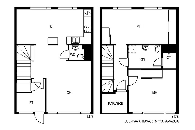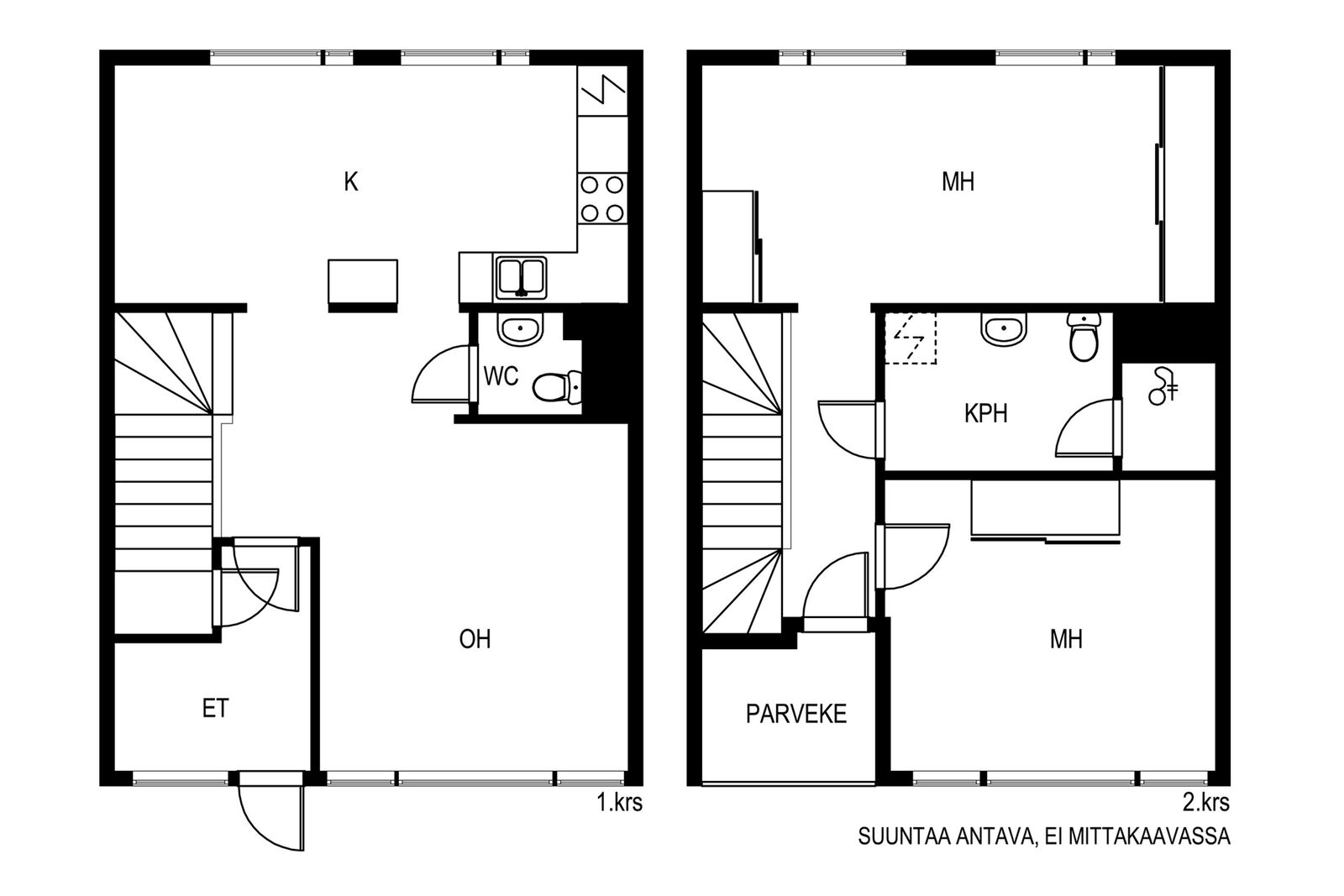 Alakerrassa tilava keittiön ja ruokailutilan kokonaisuus, jossa on runsaasti tilaa kokkailuun ja iso ruokapöytä mahtuu hyvin. Olohuoneen suuret ikkunat tuovat huoneeseen valoa ja avaruutta. Alakerrassa on lisäksi erillinen wc. Sisääntulon yhteydessä on suojaisa terassipiha.