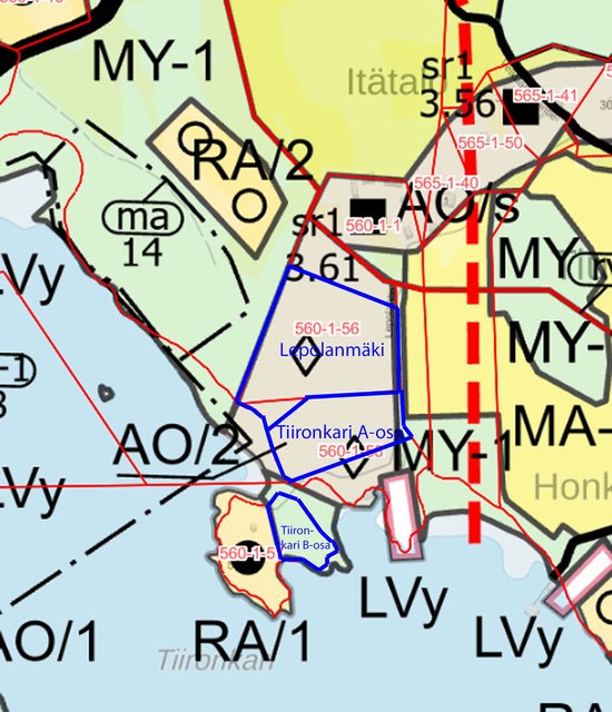 - Lepolanmäen rantaviivan pituus n. 40m. Tiironkarin rantaviivan pituus rakentamisalueen edessä n. 45m, jonka lisäksi B-alueella lisää rantaviivaa n.80m.