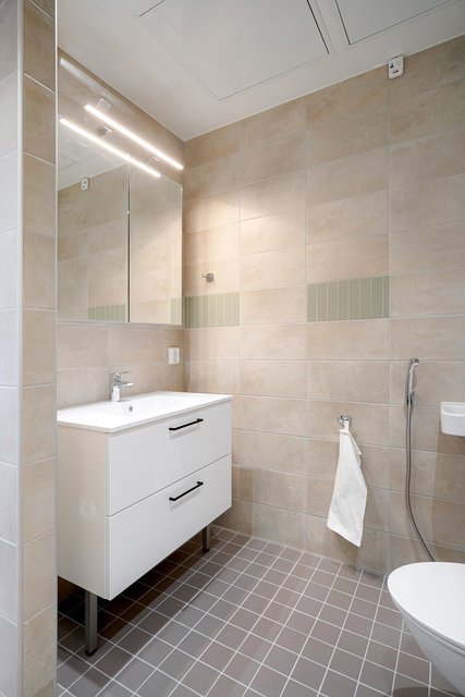 - Pesukoneliitäntä, wc-istuin, suihku, suihkuseinä, lattialämmitys, allaskaappi, peili, ja kiinteät valaisimet