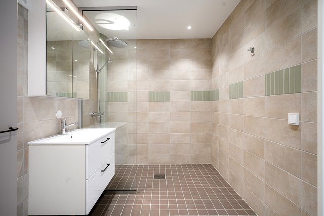 - Kaakelit, peili, valaistus, laatat, kalusteet, wc-istuin, kaapisto, ovi, katto ja suihkuseinä 2024.