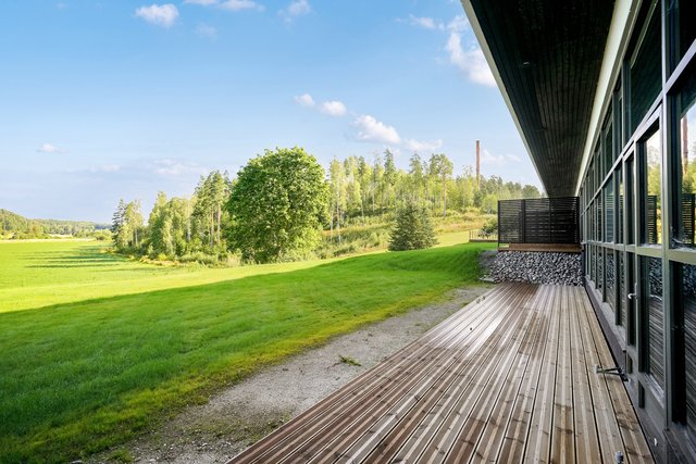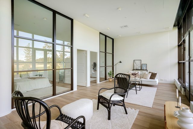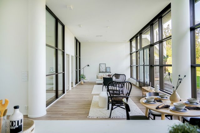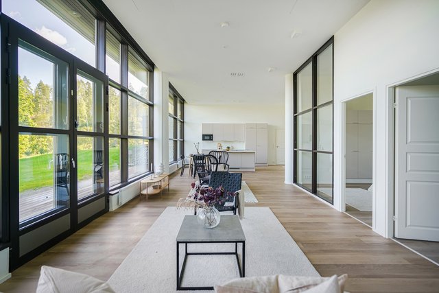 Loft asunto tuo asumisen arkeen luksusta ja myös loistavat puitteet vieraiden kestittämiseen. Isot ikkunat avautuvat asunnon käytössä olevalle piha-alueelle terasseineen.