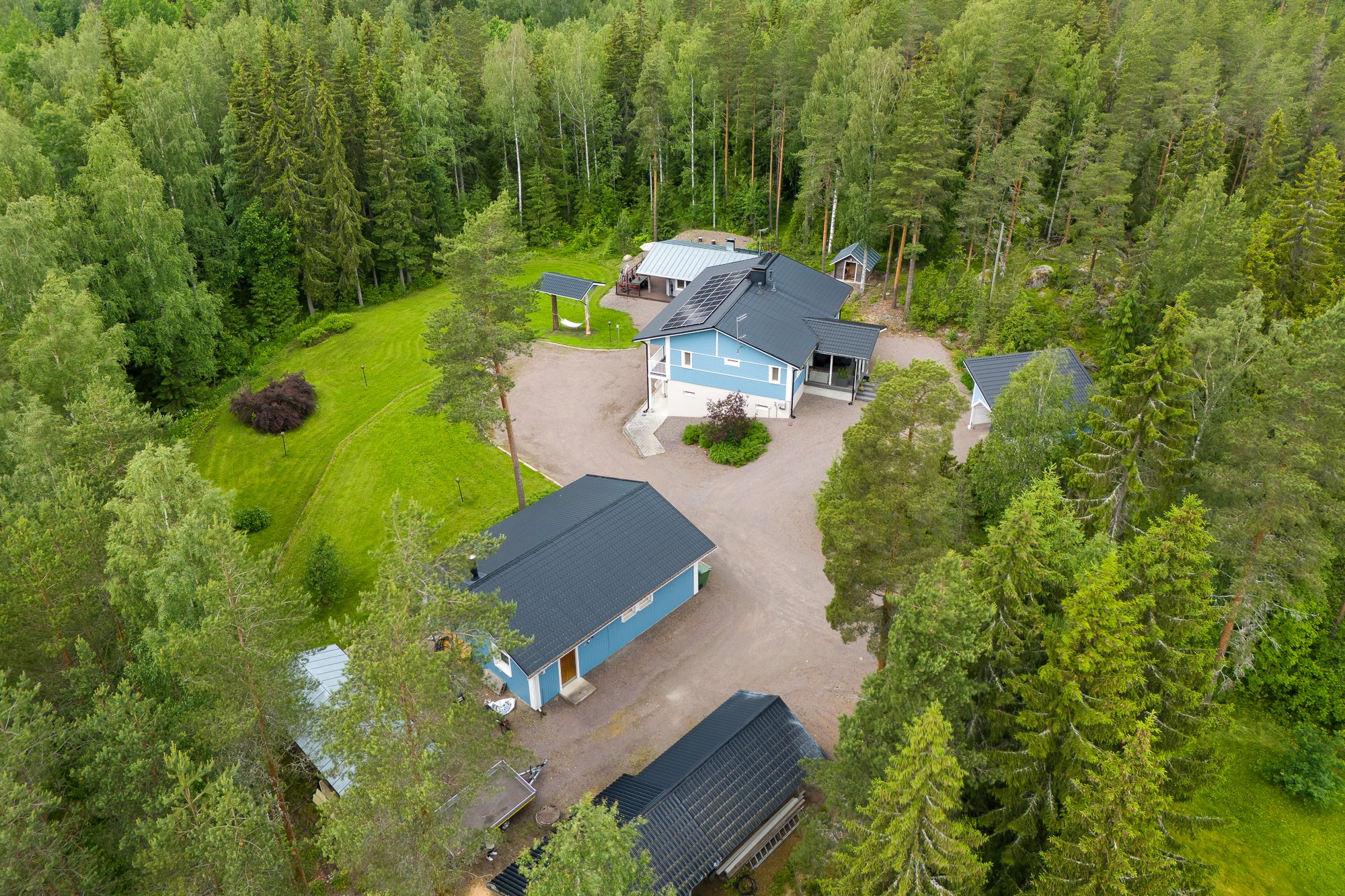 Toimivat ja käytännölliset tilaratkaisut kahdessa kerroksessa. Yläkerrassa tilava ja valoisa keittiö, jossa laskutilaa runsaasti. Olohuoneesta on käynti parvekkeelle, jolta avautuvat metsäiset, rauhoittavat näkymät. Alakerrassa oleskeluhuone/takkahuone, jossa varaava takka luo tunnelmaa ja säästää lämmityskuluissa. Vuonna 2023 remontoitu kylpyhuone, jossa kaksi suihkua sekä puulämmitteinen sauna. Tämä koti tarjoaa runsaasti säilytystilaa – kolme erillistä varastoa jo pelkästään päärakennuksessa.