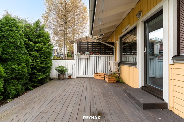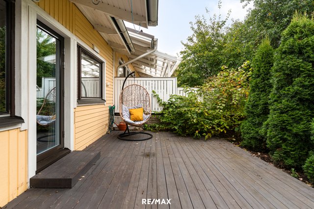- Puinen terassi peittää koko pihan. Terassi sivuilta aidattu, terassin päädyssä tuija-aita ja yksi pensas. Suojaisa terassi on etelän suuntaan. Osassa kohtaa terassia pidempi katos.