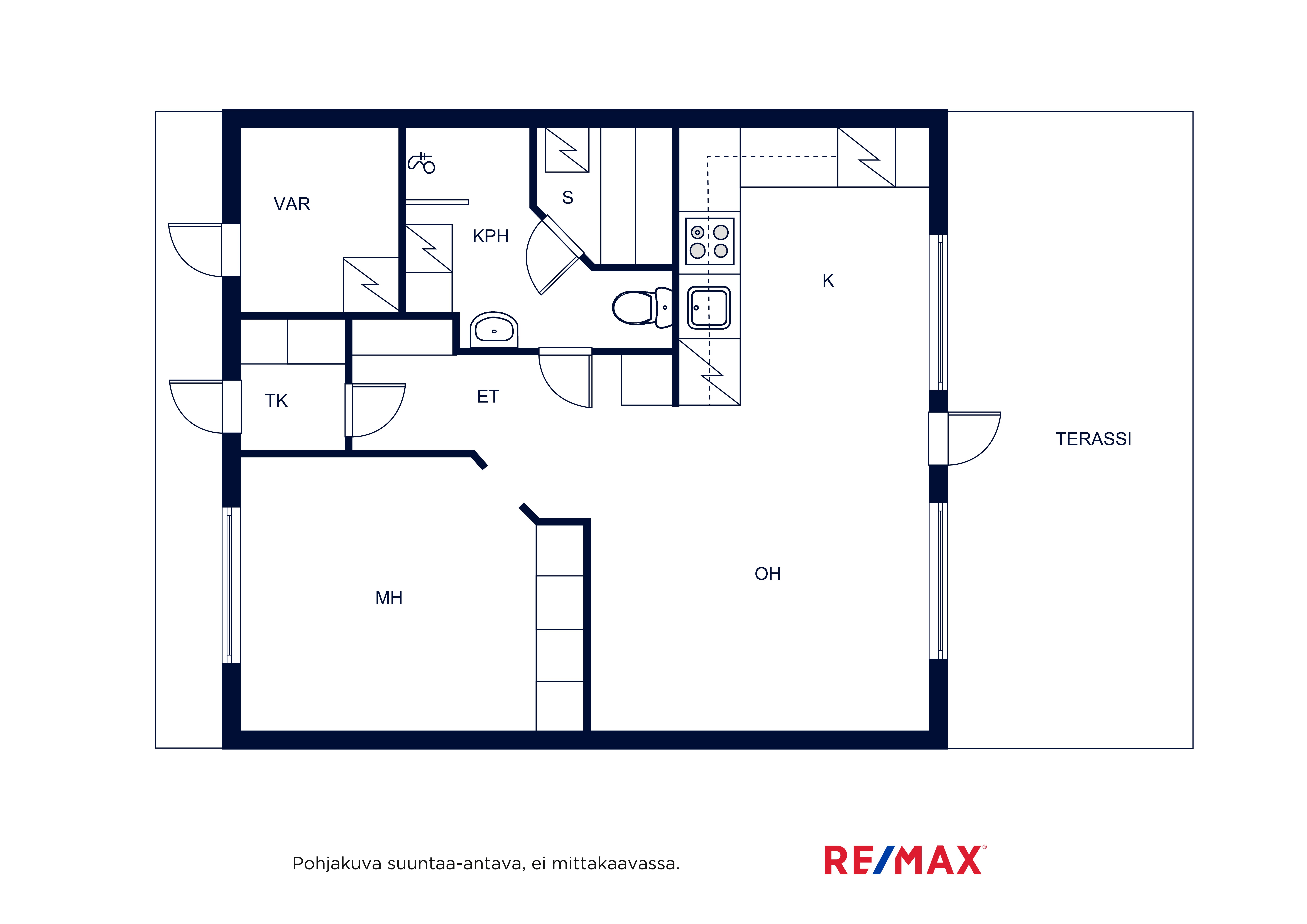 Asunnon erinomainen pohjaratkaisu sopii niin pariskunnalle kuin yksinasuvalle. Keittiö on varusteltu nykyaikaisilla laitteilla ja siinä on runsaasti kaappi- ja työskentelytilaa. Keittiöstä ja olohuoneesta avautuvat vehreät näkymät etelään suuntautuvalle terassille. Aidattu terassi tarjoaa suojaisan paikan rentoutumiseen ja terassille mahtuukin hyvin oleskelu- ja ruokailuryhmä.