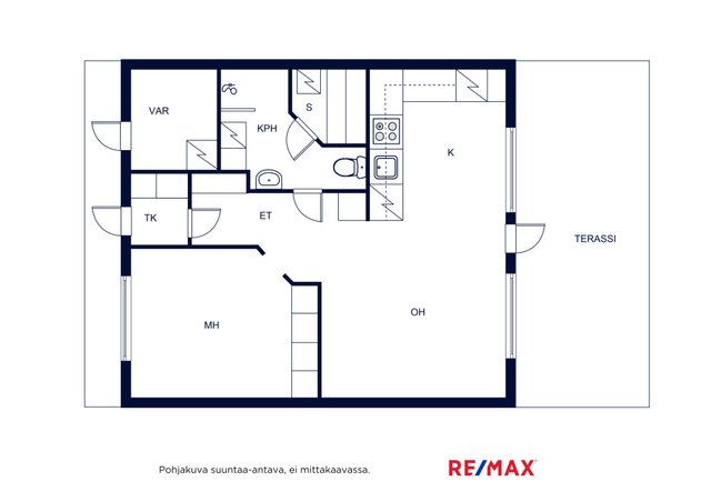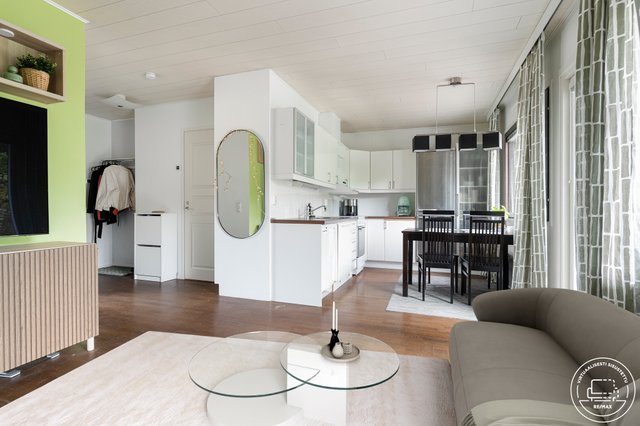 - Ilmalämpöpumppu, sälekaihtimet. Keittiön kattovalaisin ja olohuoneen seinään kiinnitetty hylly. Kylpyhuoneen pesukoneen päällä oleva kaappi on irtonainen ja kuuluu kauppaan. Ostajan halutessa myyjä voi viedä edellä mainitut kalusteet pois.