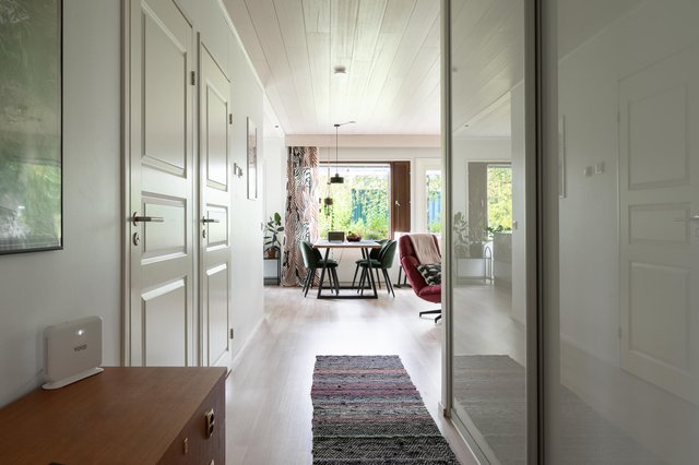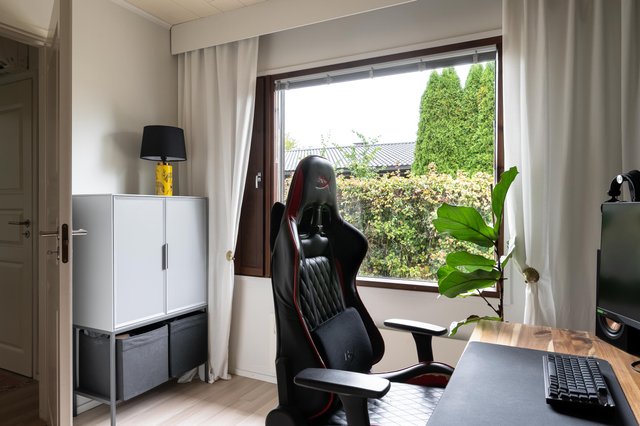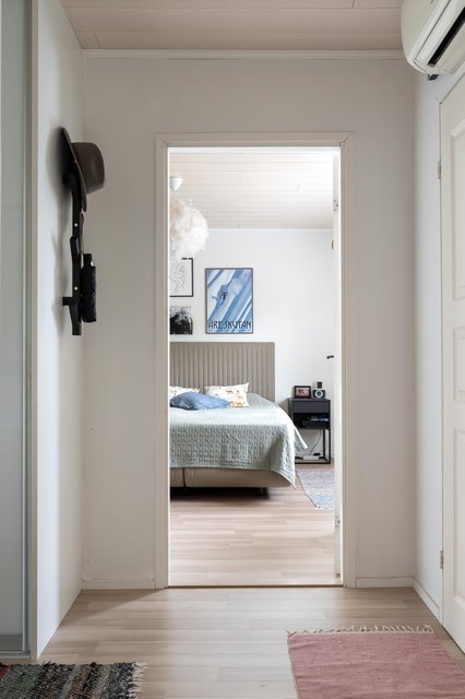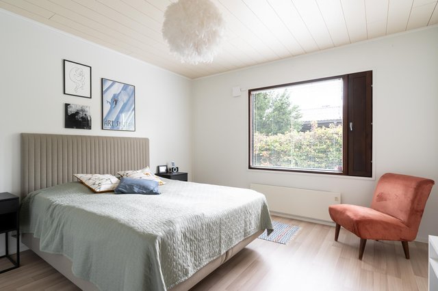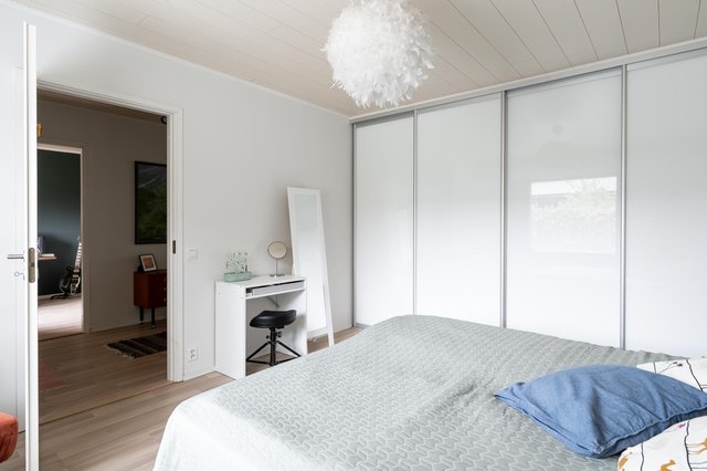 Säilytystilat ovat erinomaiset – vaatehuone, makuuhuoneen liukuovikaapistot ja tilava eteisen kaapisto pitävät kodin siistinä. Ja jos olet haaveillut makuuhuoneesta, johon mahtuu muutakin kuin sänky, se on täällä!
