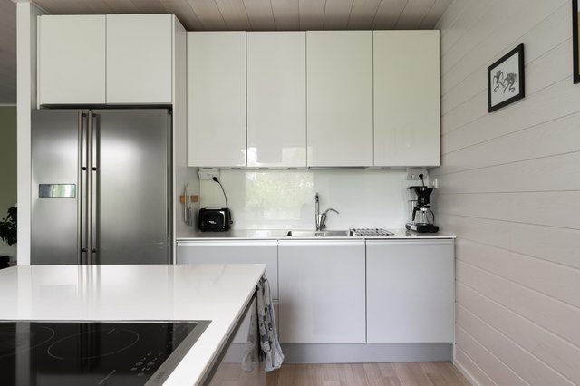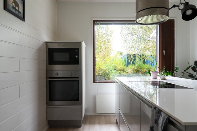 Puustellin vaaleansävyinen keittiö on laadukas ja toimiva – integroidut kodinkoneet ja suuri saareke induktiotasolla tekevät ruoanlaitosta nautinnon – ja kokkeja mahtuu hääräämään useampikin.