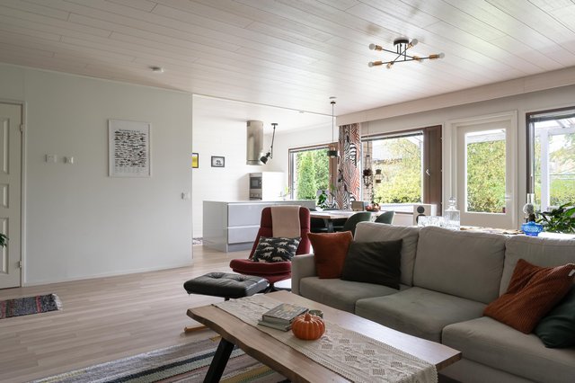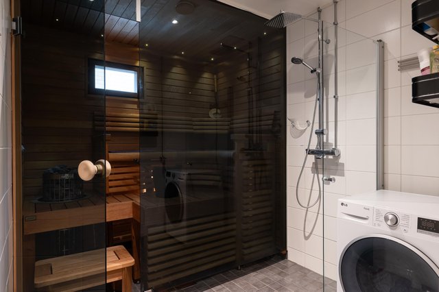 Kodin tunnelma on rauhallinen ja harmoninen: vaaleat lattiat ja huolella valitut tehostesävyt luovat kokonaisuuden, joka ei remonttia kaipaa. Moderni saunaosasto muotolauteineen ja lasiseinineen kutsuu rentoutumaan päivän päätteeksi. Wc on erillinen.