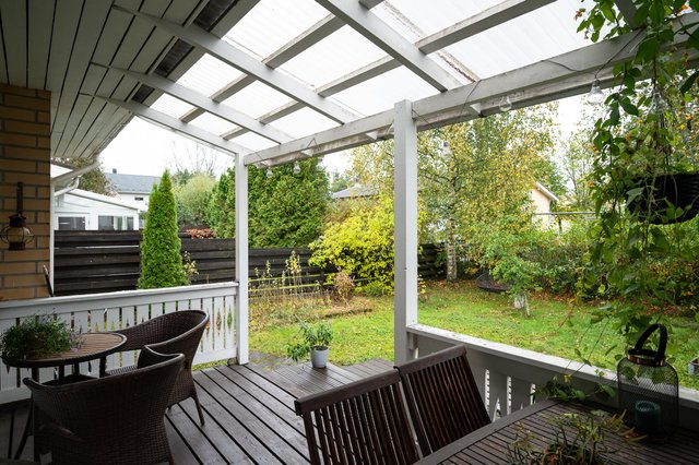 - Suojaisa ja aidattu päätypiha. Olohuoneesta käynti valokatteiselle terassille. Pääilmansuunta n. länsi ja aurinko kääntyy pihalle päivällä etelästä. Mustaviinimarja- ja vadelmapensas. Luumupuu.