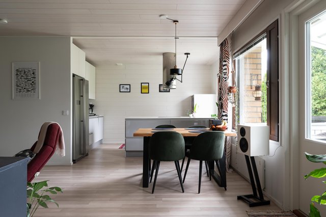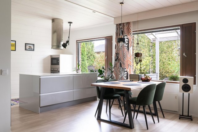 Olohuone, ruokailutila ja keittiö muodostavat yhtenäisen, poikkeuksellisen tilavan kokonaisuuden, joka on helppo kalustaa monella tavalla. Tilaa riittää niin isommalle ruokapöydälle kuin reippaan kokoiselle kulmasohvallekin kotoisaa tv-iltaa varten. Ikkunan ääreen mahtuu myös ihana laiskanlinna lukuhetkiä varten.