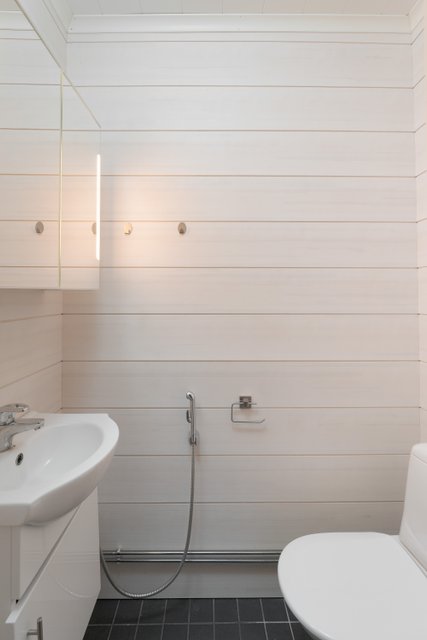 - Lattia laattaa, seinät paneelia. Wc-istuin, peilikaappi, pesuallas, allaskaappi ja bidee-suihku.