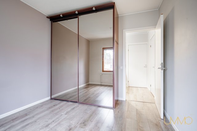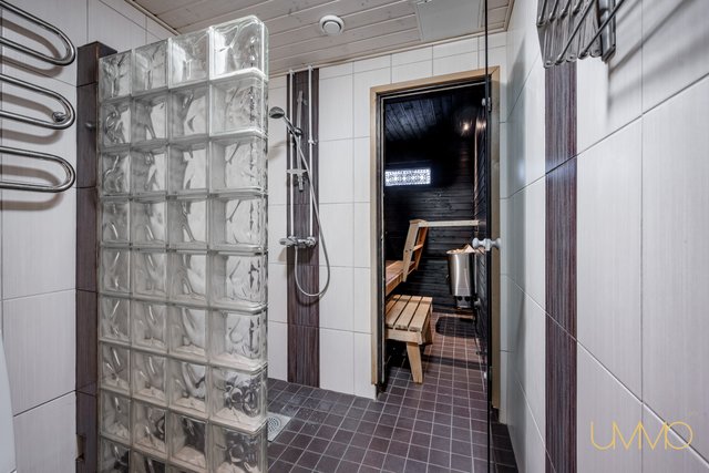 Yläkerrassa on kaksi mukavan kokoista makuuhuonetta. Makuuhuoneissa on liukuovikaapistot tuomassa lisää säilytystilaa. Kylpyhuone ja saunaosasto ovat remontoitu vuonna 2009. Kylpyhuoneessa kodin toinen wc-istuin sekä tila pesukoneelle.