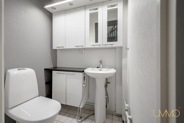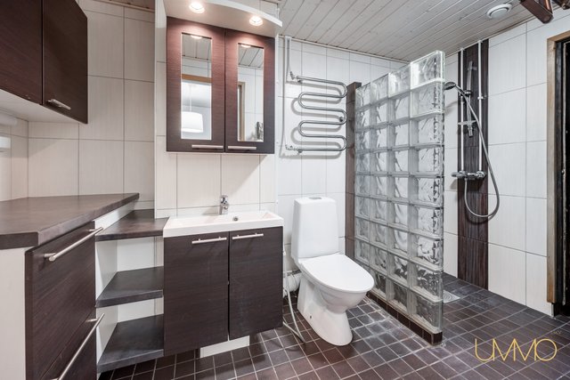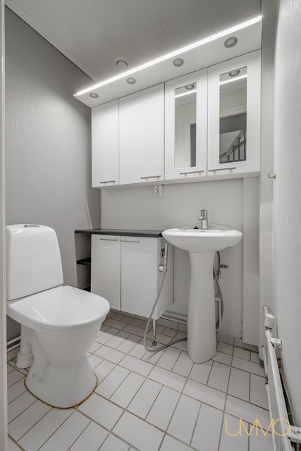 - WC-istuin, suihku, pesukoneliitäntä, allaskaappi, ja peilikaappi