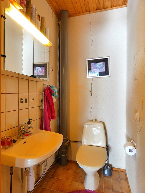 - Kuntotarkastusraportti 2024: painumisvaurioita tai virheitä rakentamisessa => talon seinät ja lattia kallellaan.