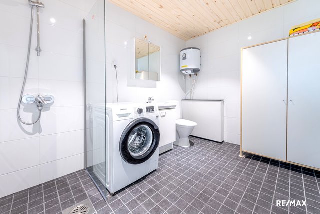 - WC-istuin, suihku, suihkuseinä, pesukoneliitäntä, lattialämmitys, peilikaappi, allaskaappi, ja pesuallas