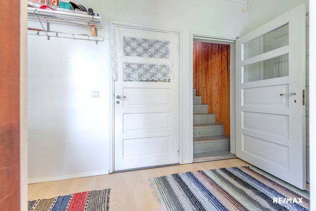 Keskikerroksessa uusittu tilava kylpyhuone, olohuone, ruokahuone ja remontoitu keittiö sekä myymäläkäytössä ollut tila. Yläkerrassa oleskelutilan lisäksi kaksi makuuhuonetta ja runsaasti komero tilaa. Tulisijoja talossa on kaksi; varaava takka olohuoneessa ja valurauta takka toisessa makuuhuoneessa. Sauna löytyy kellarikerroksesta. Pääsisäänkäynti on takapihan puolelta.