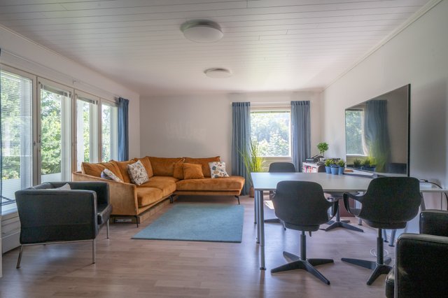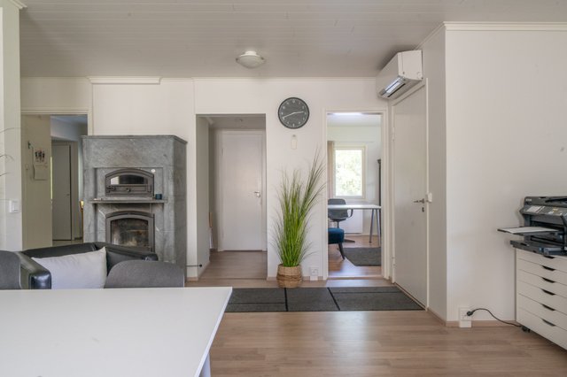 Lämmitysjärjestelmä päivitetty öljystä ilmasta-veteen lämpöpumppuun (Nibe, asennettu 2022), lisäksi varaava takka ja ilmalämpöpumppu.