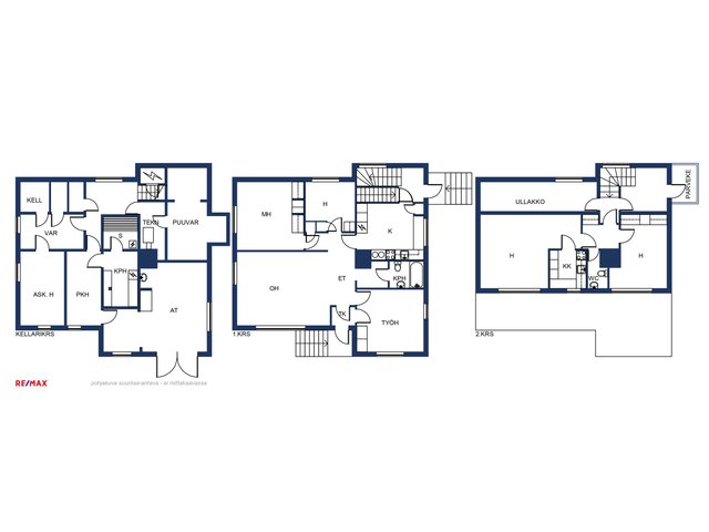 AK: 3mh, oh, k, wc. YK: oh/k, mh, kph. Kellari: AT, kph, s, varastotiloja.