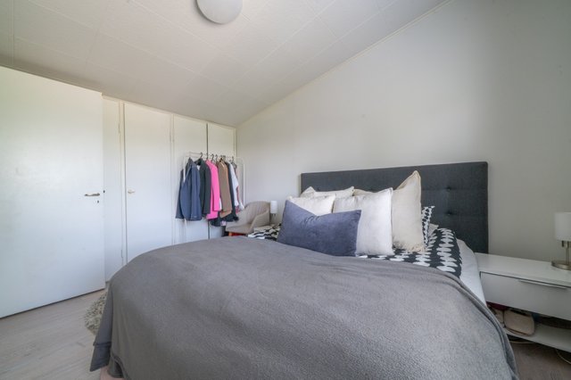 Yläkerrassa on erillinen asunto omalla sisäänkäynnillä, jossa on makuuhuone, keittiö/olohuone ja kylpyhuone. Tämä tila soveltuu loistavasti vuokrattavaksi tai vaikka perheen nuorelle tai isovanhemmalle. Halutessaan yläkerran voi helposti yhdistää muuhun taloon myös sisäkautta.