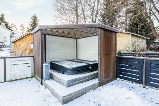 Sauna lämpiää aidosti puilla ja terassin porealtaassa voi nautiskella vaikka pakkasillalla, ympäri vuoden. Alakerrassa on erilliset työhuoneet, jotka sopivat esimerkiksi etätyöhön tai yritystoimintaan. Aidattu terassiosuus on turvallinen lapsille ja lemmikeille.