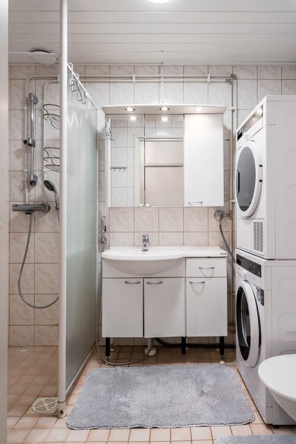 - WC-istuin, suihku, suihkuseinä, pesukoneliitäntä, lattialämmitys, peilikaappi, pesuallas, allaskaappi, ja bidee-suihku
