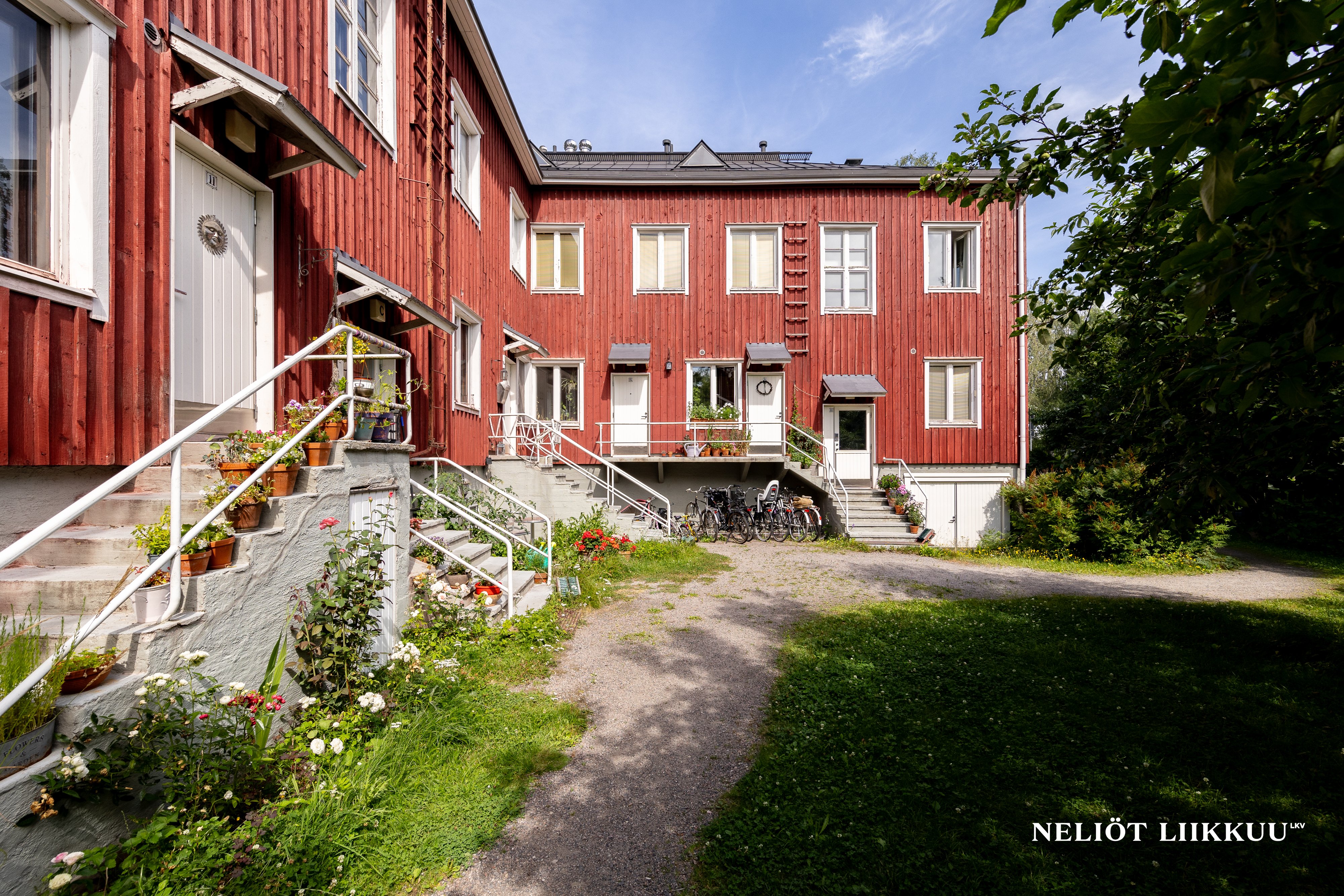 Kaksi erillistä varastoa tuovat arkeen lisää säilytystilaa, ja taloyhtiön yhteiset tilat, kuten sauna ja suojaisa sisäpiha tukevat huoletonta asumista. Piha on vihreä keidas, jossa vuodenajat todella tuntuvat.